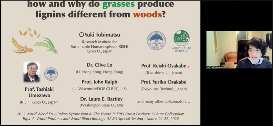 Monocotyledonous grasses have evolved unique cell wall structures distinctively different from those of typical wood species, i.e., eudicots (hardwood) and gymnosperms (softwood). As a prime example, grasses produce lignins highly decorated by hydroxycinnamates (p-coumaroylates and ferulates) and flavonoid tricin units by incorporating grass-specific lignin monomers, i.e., γ-acylated monolignols and a flavone tricin, alongside canonical monolignols for cell wall lignification, which contrasts typical eudicot and gymnosperm species that utilize monolignols as sole lignin monomers. Currently, it remains largely unknown how such grass-specific lignin monomers are biosynthesized and function in grass cell walls. Moreover, how the existence of the grass-specific lignin decorations affects the utility of grass biomass remains poorly understood. In this context, our group has been investigating the biosynthesis of the grass-specific lignin monomers and exploring bioengineering approaches to produce transgenic grass plants with altered lignin decoration units. In this presentation, I will briefly summarize our recent findings regarding the biosynthesis of the lignin-associated hydroxycinnamates and flavonoid tricin in rice, a model grass species and an economically important grass crop, and structure and property characterizations of transgenic rice plants that produce cell walls lacking grass-specific lignin decorations. Deepening our understanding of the biosynthesis and properties of grass cell walls may contribute to better understanding of the nature and evolution of wood cell walls.