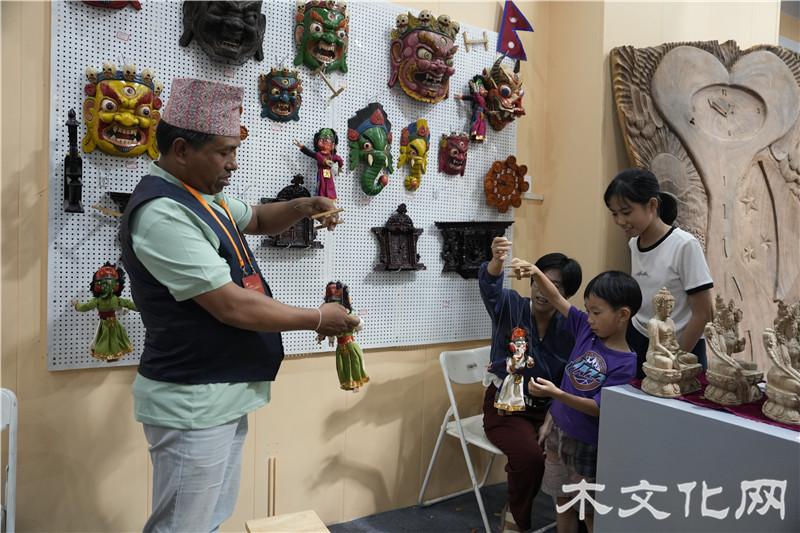 在展览的互动体验区,尼泊尔木雕协会会长Ratna携带了尼泊尔特色传统手工艺品木雕花窗、木质面具等,并为观众现场演示了尼泊尔传统木雕雕刻。Dharma是尼泊尔手工艺协会联合会前任主席,也是一名是唐卡绘画和雕塑艺术家,他携带了很多精品唐卡作品参展,并现场演示唐卡绘画技艺,展示了尼泊尔独特的文化遗产。现场还设置了手工体验区,可制作筷子、勺子等,令观众充分感受手作的乐趣。