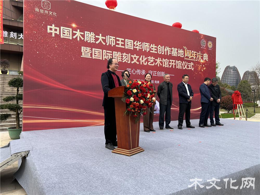 2024世界木材日中国响应活动于3月21日在江西南康家居小镇举行。本次活动由国际木文化学会和国家林业和草原局木文化创意产业国家创新联盟指导,江西南埜木文化有限公司主办,活动包括木雕大师王国华师生创作基地周年庆典、国际雕刻文化艺术馆开馆、植树和民俗体验四项内容。相关单位领导、业界工艺美术大师代表、行业协会和产业界代表、当地学生学徒代表等出席活动。庆典仪式结束后,与会嘉宾参加了庆祝“2024世界木材日”植树活动,在草坪上种植了一棵罗汉松和十棵红花继木,共同为这片艺术土地种下了新的生命。活动现场还举办了宁化活字印刷、手工筷子制作、非遗雕刻等民俗表演和体验活动,让观众亲身感受到了非遗传统技艺传承的厚重意义。