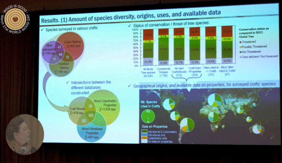Analyses examine the proportion of threatened species, compared between all World tree species (c. 60,000), all commercial timber species (c. 1,700), and species specifically used in above-stated woodcrafts. Threat levels and craft uses were analyzed in relation to physical-mechanical and colorimetric properties. Results suggest that wood species having “exceptional” physical-vibrational and/or colorimetric properties, also tend to have the most concerning levels of threat, although not systematically. This worrying prospect will be discussed in the light of how crafts could adapt, by changing viewpoints and/or practices, and on how the situation of culturally important woods may help to raise public awareness on the global erosion of tree biodiversity.