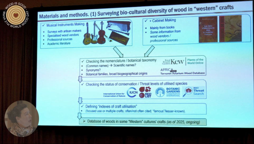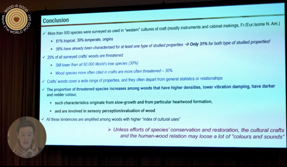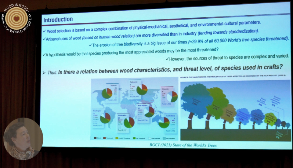 Wood selection is based on a complex combination of physical-mechanical, aesthetical, and environmental-cultural parameters. Artisanal uses of wood (based on human-wood relation) are more diversified than in industry (tending towards standardization). The erosion of tree biodiversity is a big issue of our times. A hypothesis would be that species producing the most appreciated woods would be the most threatened. However, the sources of threat to species are complex and varied (wood exploitation, agro-industry, urbanization, fire, climate change, shifts in land use and ecosystems, invasive species, etc.). Therefore: is there a relation between wood characteristics and level of threat on species?