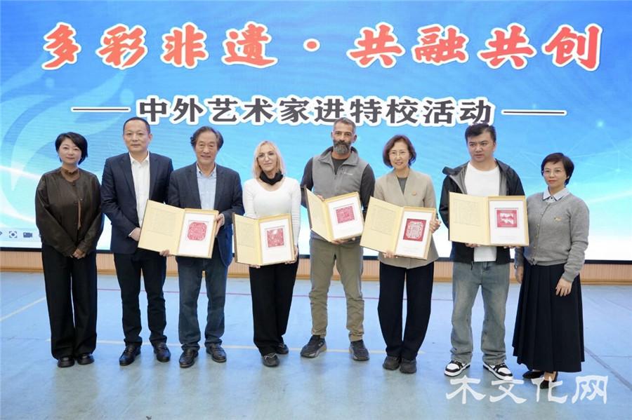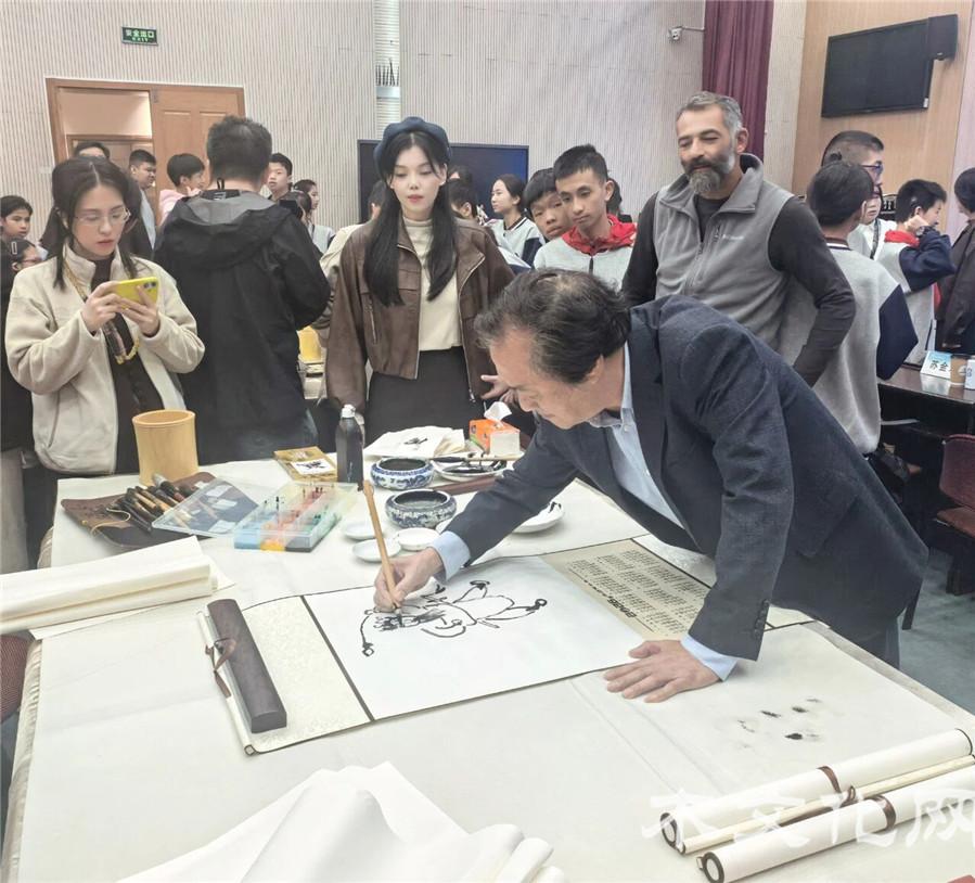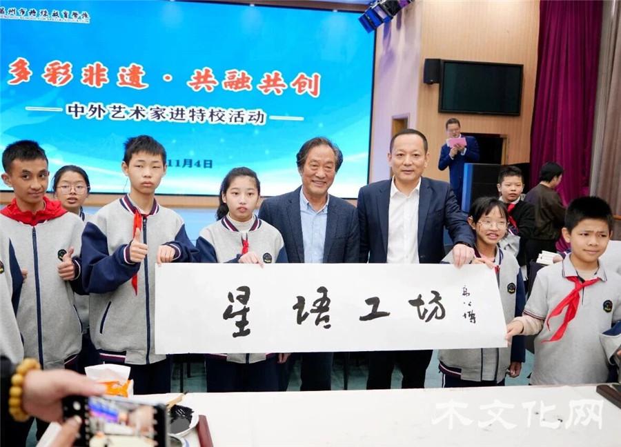 在随后两小时的“多彩非遗共创环节”,在美术组老师协调下,师生与艺术家分组创作:共绘木制花瓶、笔筒,复刻高公博大师脸谱图案,携手完成国画,墨色间满是文化交融温情,学生们大胆向中外艺术家提问,将奇思妙想融入木艺创作,沉浸式体验非遗魅力。