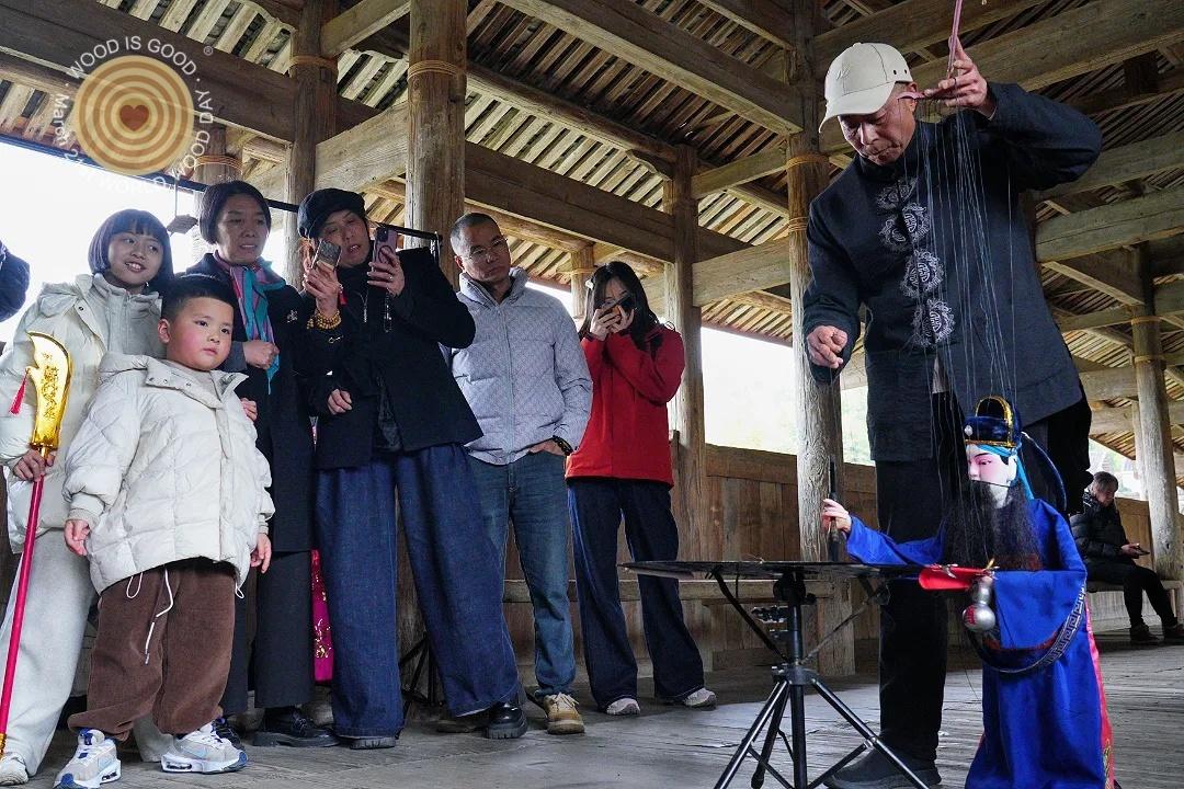 上午10时,北涧桥、溪东桥、文兴桥同步开启沉浸式互动。提线木偶戏、杖头木偶戏组成快闪队伍穿梭古桥,即兴献艺,游客驻足打卡,沉浸式感受“古桥映偶戏”意境。一名游客表示,今天是第一次看木偶戏表演,手艺人技艺精湛、十分惊艳,同时在廊桥上观演沉浸感十足,真切感受到了非遗魅力。