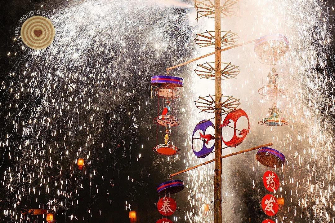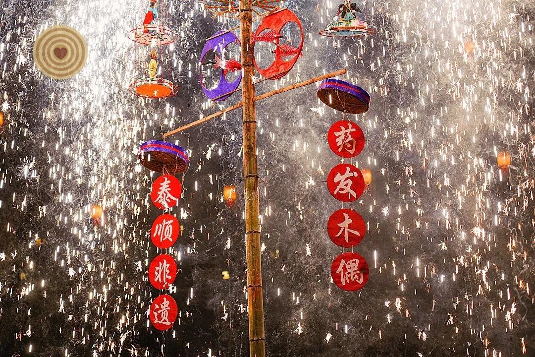 夜幕降临,“国遗启幕 廊桥和鸣”惠民展演在筱村公社精彩上演。《顺偶迎宾》《药花祈丰年》《十八相送》《大鱼海棠》等8个精品节目轮番登台。药发木偶戏以夜空为幕、烟花为伴,再现泰顺“空中偶戏”千年奇观,惊艳全场。泰顺药发木偶戏市级非遗传承人周祖余说道:“药发木偶是泰顺独有的技艺,这次表演《药花祈丰年》,就是想让更多人看到这门古老技艺的魅力,把它好好传承下去。”