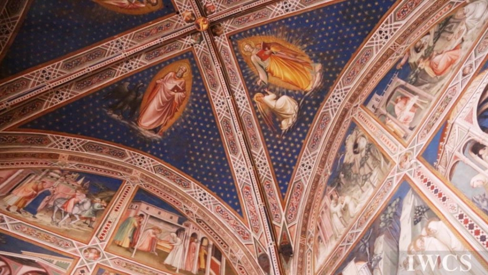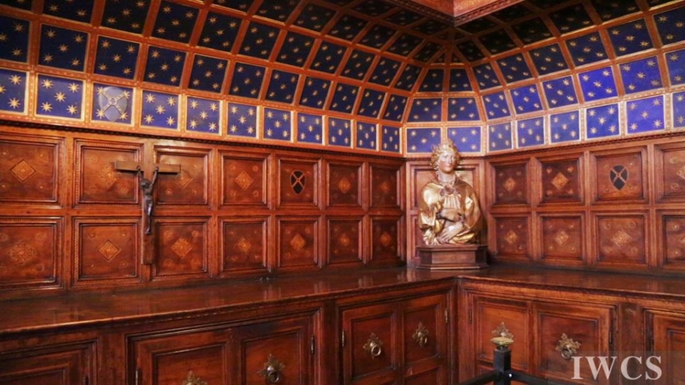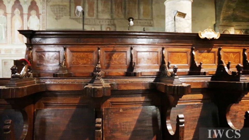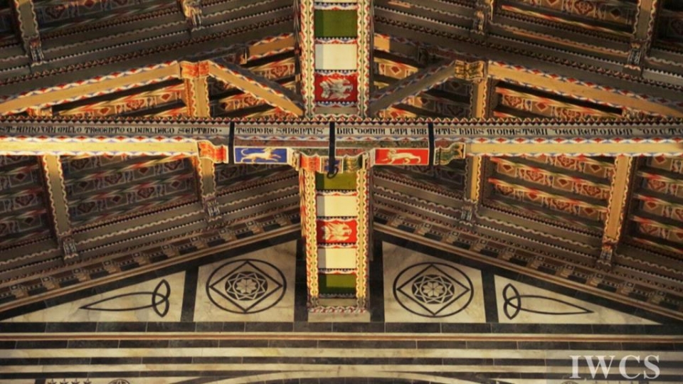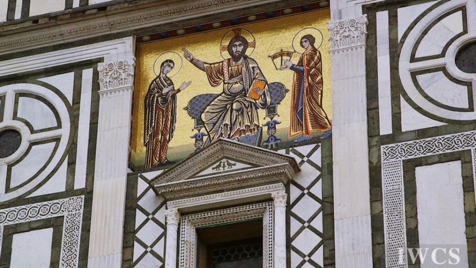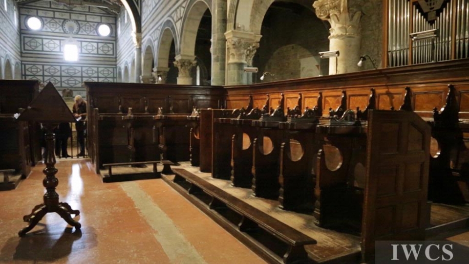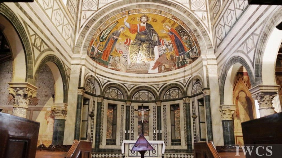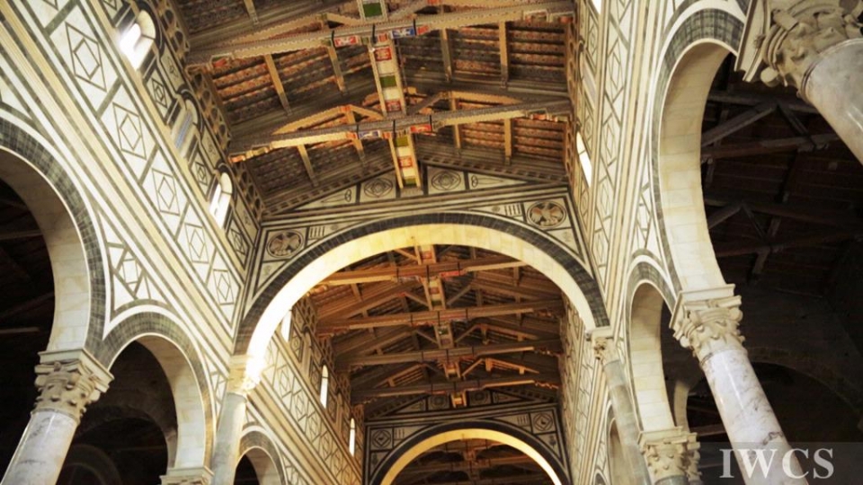 San Miniato al Monte is a basilica located in Florence, Italy. The basilica is situated atop one of the highest points in the city, and characterized and constructed in the classic Tuscan Romanesque architectural style. The wooden roof truss is painted with bountiful colors and decorated with adornments, and there’s an uncommon walkway built within the roof truss for people to decorate the roof truss. In addition, the wooden music stand for the choir was exquisitely made in approximately 1420.