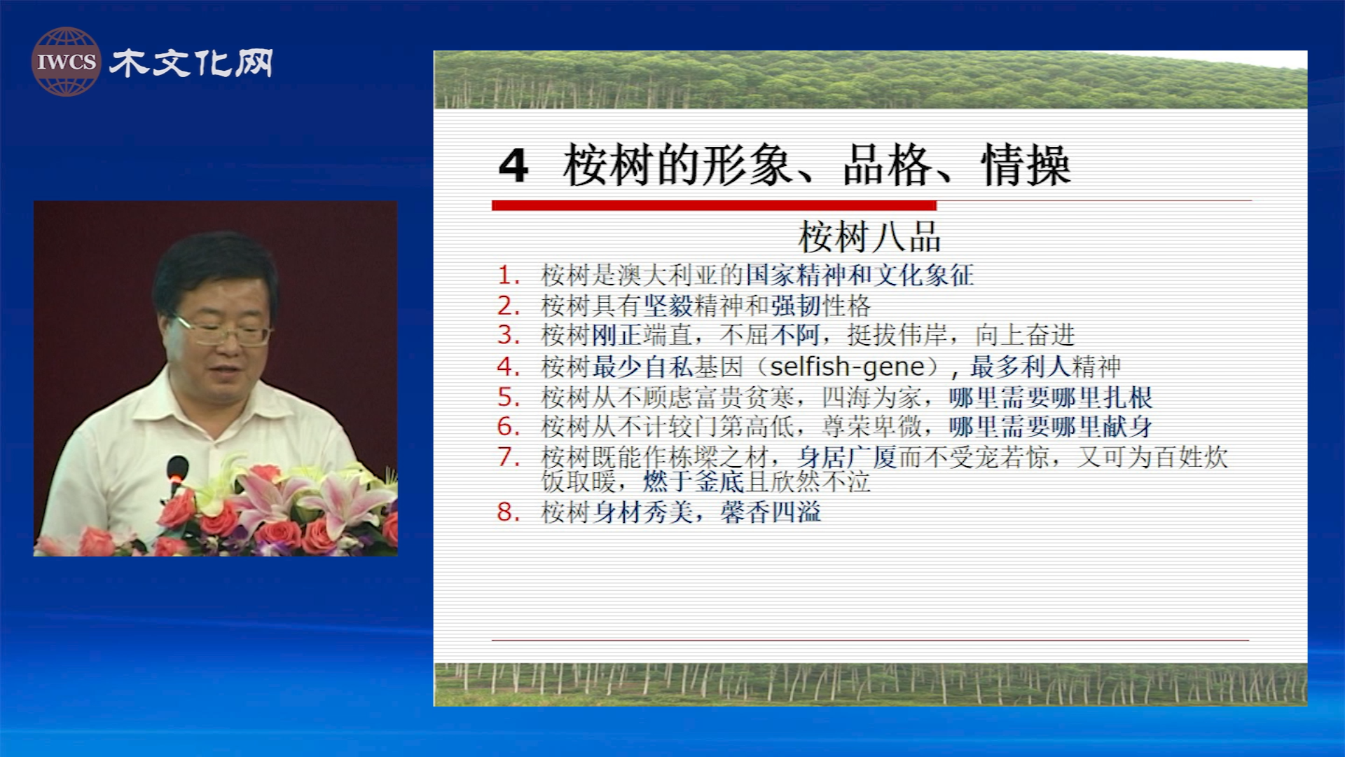 树种文化-桉树 2011/09/295,279 会议名称:全国第三届森林文化学术研讨会 会议时间:2009年10月 会议地点:中国·临安 报告嘉宾:莫晓勇,教授,华南农业大学 编辑:iwcs24LKZ/PH