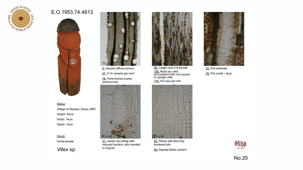 The species diversity of trees in Central Africa is particularly high and for this reason also the wood ethnographic objects are quite diverse. In general, the choice of wood depends on locally available species, technical common sense or religious considerations, as is the case for masks made of wood from the sacred tali tree (Erythrophleum suaveolens) which is very difficult to carve.