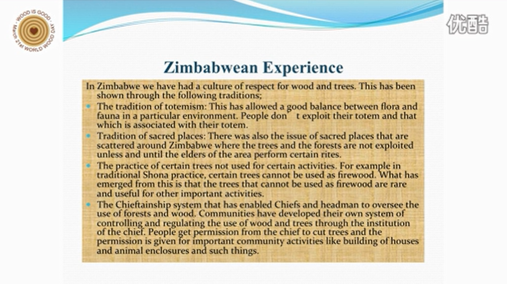 Wood has been one of nature's greatest gifts to mankind. Wood and wood-based products are the most important of all man's resources for three main reasons; wood is universal, it is a raw material that can satisfy almost every requirement or existence. Wood is abundant, more than eight billion acres, one quarter of the total earth's surface, are forested. Wood resource is inexhaustible and renewable, the forest is not a mine that will be depleted as it is very easy to renew. The Zimbabwean Experience has provided lessons in sustainable use of wood especially its traditional practice namely; The tradition of totemism, Tradition of sacred places, The practice of certain trees not used for certain activities and the Chieftainship system that has enabled Chiefs and headman to oversee the use of forests and wood. The greatest threat to Sustainable Use of Wood/Tree is commercialization of the wood and wood products and destruction of traditional practices. The use of wood in art has been as long as the people of Zimbabwe. Arts will never and has never been a threat to sustainable use of wood in Zimbabwe although many organizations have argued and in some cases banned wood sculpting.
