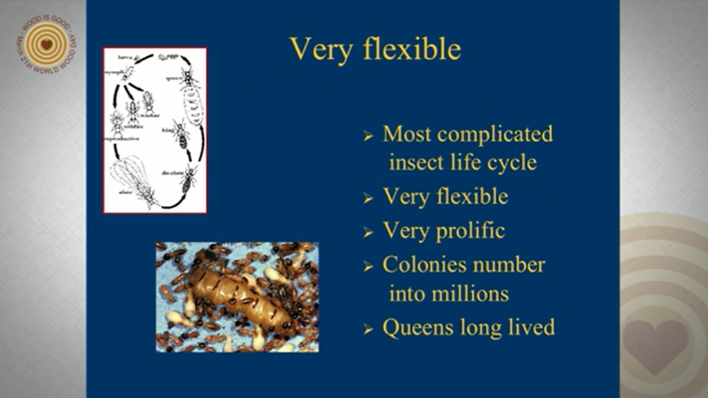 Worldwide, there are more than 2,300 different species of termites now recognized. Much of termite diversity can be divided into four groups: subterranean, mound builders, aerial nesters, and single piece feeders. Much of this diversity occurs in Africa. At the ecosystem level, termites are very important for recycling soil nutrients, soil aeration, and recyclers of plant biomass. Unfortunately, termites can pose problems to some agricultural crops, tree plantations, earth dams, urban landscapes, and wooden structures. Fortunately, the numbers of termite species that are considered destructive to the world’s agricultural and urban habitats are few when compared to the total diversity. During my presentation, I will review important termite groups by continent. I will also give the latest updated on research pertaining to termite detection and control. Also during my presentation, I will stress the need for balance when managing termite populations with the growing concern to protect non-target organisms, water and environmental quality, and need to protect termites to do their very beneficial job of recycling cellulose.