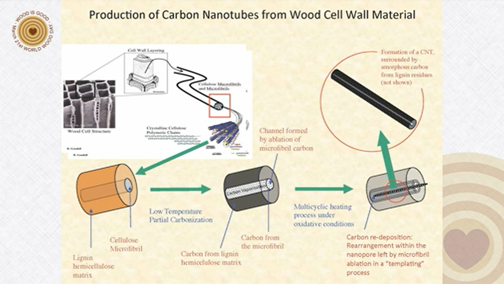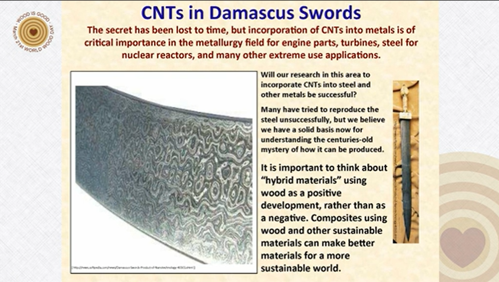 Wood is an amazingmaterial. We already know much about its properties and its versatility for usein many applications. In reality however, we have just have seen the “tip ofthe iceberg” with regard to the many ways wood will be used in the future. Woodis used in many functional and artistic ways as a solid product. These useswill continue to expand as creative minds find new ways to transform solid woodinto useful and visually esthetic products. The use of wood will alsoexpand as we find new ways to convert wood strands and fiber into composites,produced solely from wood and adhesive or by bonding wood to other materials. Many advanced products, such as the floor ofthe Corvette sports car are made from advanced wood hybrid composites becauseof the unique properties that wood imparts when combined with other materials. Today,as we learn more about the nano-scale properties of cellulose and lignin, it isopening up our thinking to new ways that we can use wood for a variety offuture products. On otherfronts, wood and other lignocellulosic materials have always been used as asource of energy - stored energy from the sun - released when we burn solidwood. Today though, we can also think of wood as a source of liquid fuels.Conversion of wood by bacteria, fungi and algae to a variety of fuels will helpus to reduce our reliance on fossil fuels. Similarly, bioconversion processesare being developed to convert the lignin residues from biomass into usefulchemicals and feedstocks for a variety of biopolymer plastics and adhesives.Science is continually revealing new and exciting things about wood. Newadvances include knowledge about the mechanisms that fungi, bacteria, insectsand even marine borers use to transform and degrade wood, through to thediscovery of new structures within the wood cell that never before have beenvisualized. Scientists have even begun to unravel the ancient mystery of woodwas used to produce Damascus steel, a secret lost for centuries and only nowbeing re-discovered with new findings of how the wood was reformed into carbonnanotubes within the steel! This talk will discuss some of these findings.Although wood has many uses, and more are being discovered every day, we mustcontinue to understand and appreciate the role that wood and its precursormaterials have played over the millennia in carbon sequestration and carboncycling. Exploring these new uses for wood in solid products, hybridcomposites, chemical feedstocks, and energy sources are the key to helping theworld move closer to becoming a more carbon-neutral and sustainable planet.