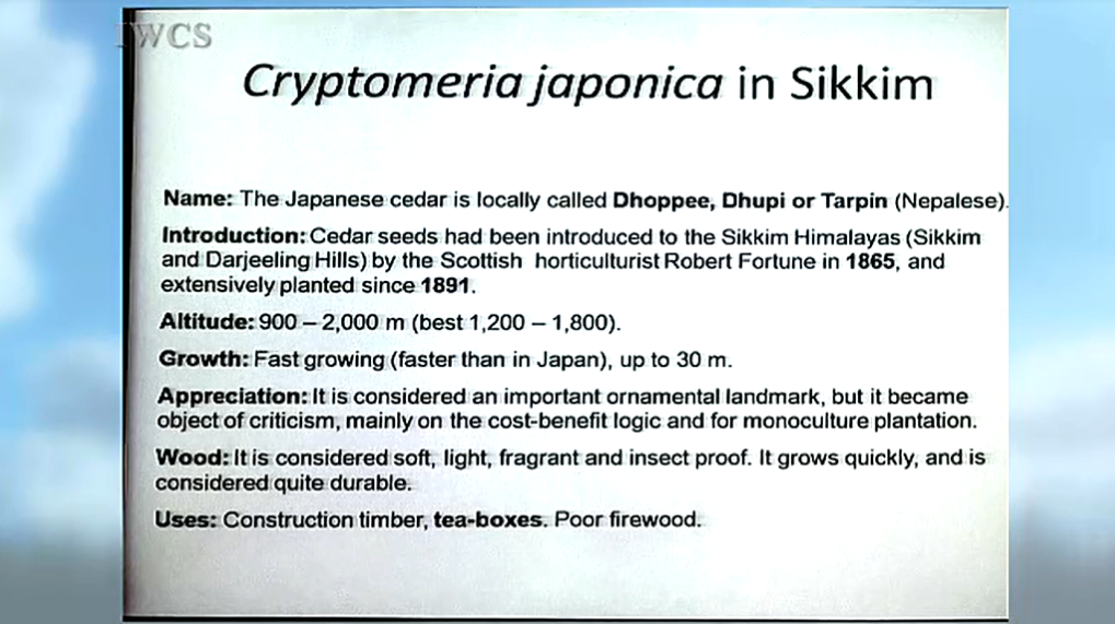Further investigations revealed that this tree was introduced to Sikkim and adjacent Darjeeling, in the 19th century as a suitable timber tree species for making tea boxes. My presentation will explain the fascinating history and circumstances of the introduction of the Japanese cedar to northern India.