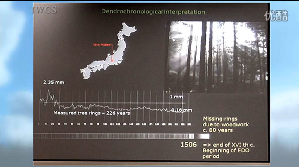 The wood anatomy shows that two trees seem to have been used: Cryptomeria japonica (Sugi) and Chamaecyparis obtusa (Hinoki). The dendro-chronological measurements made on the elements of Hinoki indicate that fragments were extracted from the same tree, probably of more than 3 centuries and the most recent and preserved tree rings take place at the beginning of the XVIth century. But for diverse reasons which we shall explain, the date of cutting down took place from the end of the XVIth century that is to say the initial phase of Edo period. The forest origin of wood is biogeographically similar to chronologies established for the region of Nagano, Japan. This current study, led jointly between France and Japan, will continue by additional xylometrical studies to pull the maximum of information.