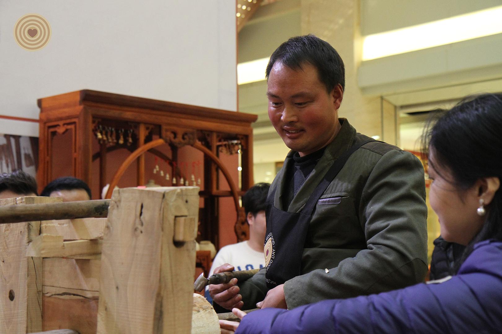 现场吸引观众眼球的还有一台“高大上”的古老木旋床,李学民先生坐在旋床上给观众展示着传统木旋技艺。他用两只脚一上一下交替踩着车床下面的踏板,带动旋轴左右转动,根据木材料的大小,套旋出一个个彰显古朴韵味的木碗,让人们体会到木与生活是那么的亲切。李学民先生认为传统木旋与现代木旋各有优势,应该有机结合起来,达到完美。