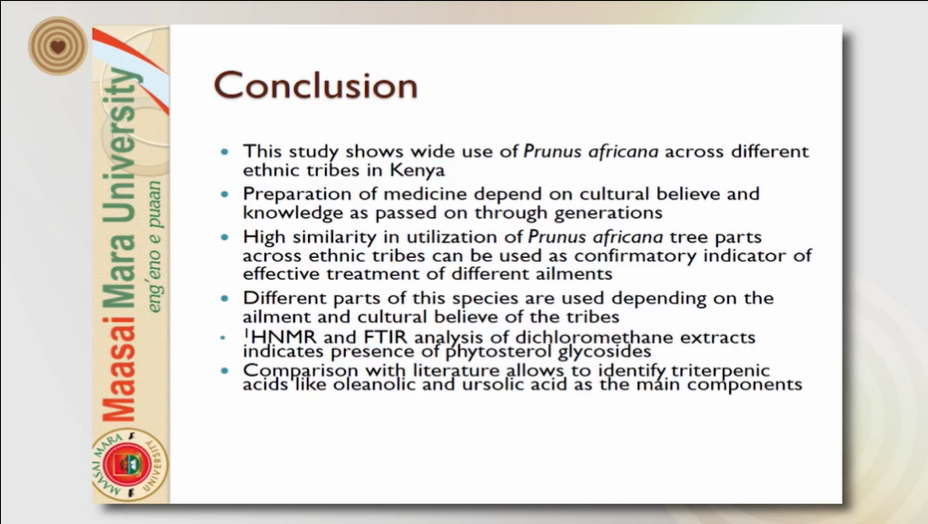 Results showed that Prunus africana species is widely used traditionally by Kenyan tribes for treatment of different health problems. Administration as herbal medicine to patients is slightly different based on cultural believes for the tribes depending on the ailment and the part of tree utilized. A total of twelve different health problems were found to be treatable using different tree parts of this species. Prostrate hyperplasia was a major health problem cutting across all the tribes and bark decoction was the common treatment. Chemical analysis of bark extract showed presence of triterpenic acids like oleanolic and ursolic acid.