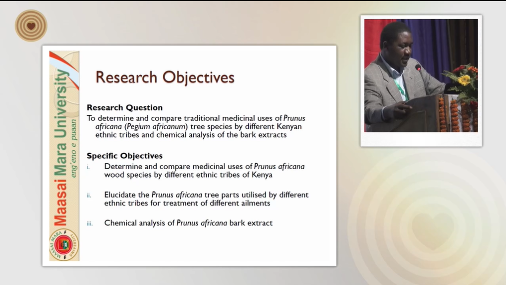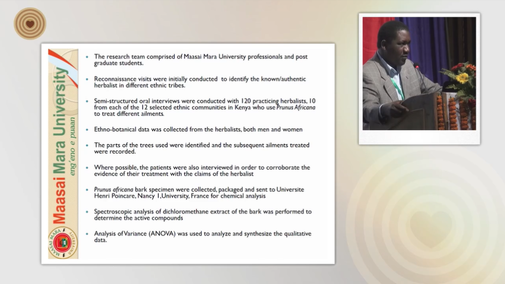 A study was carried out on traditional herbal use of Prunus africana wood species by different Kenyan tribes. Interviews were conducted and questionnaires administered to groups of respondents from different ethnic groups in Kenya. Analysis of Variance (ANOVA) was used to analyze and synthesize the qualitative data. Spectroscopic analysis of dichloromethane extract of the bark was performed using NMR equipment to determine the active compounds.
