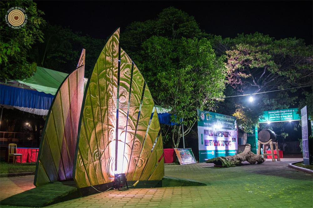 由国际木文化学会联合柬埔寨皇家研究院共同主办的“2018年世界木材日”系列庆祝活动之“大型木雕合作项目”,汇集了来自世界各地的各领域艺术家——木雕师、电影布景设计师、雕塑家、木工师、时装设计师和画家共同参与。与2017年在加利福尼亚州长滩的大型木雕合作项目有所不同,本次项目在整个过程中都面临当地设备和材料的限制,创作方式不得不回归到早期的实践形式。然而这样的条件却使得项目成员们更加团结一致,一个个变身为解决问题的创意高手。