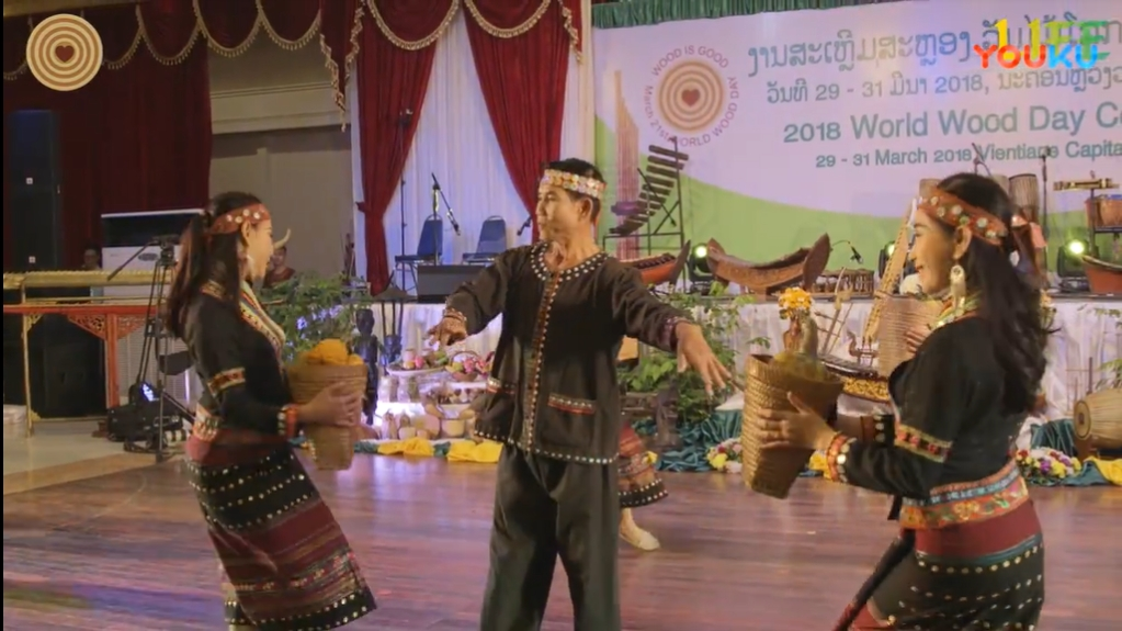 在2018世界木材日老挝庆祝活动的闭幕式上,东道国以传统的音乐和舞蹈展现了老挝人民劳动丰收的喜悦。2018世界木材日——老挝系列庆祝活动于3月29日至31日在首都万象国际贸易交流中心(ITECC)成功举办。活动是继2018世界木材日“大湄公河次区域——柬埔寨暹粒”之后的又一重要活动,来自20个国家和地区的近百位外国嘉宾与老挝本地匠师一起,通过木雕创作、木民俗工坊、音乐节、木旋演示、青年家具制作、儿童木育、木与生活摄影展以及植树活动来展示人类与自然和谐相处的多种生活方式。