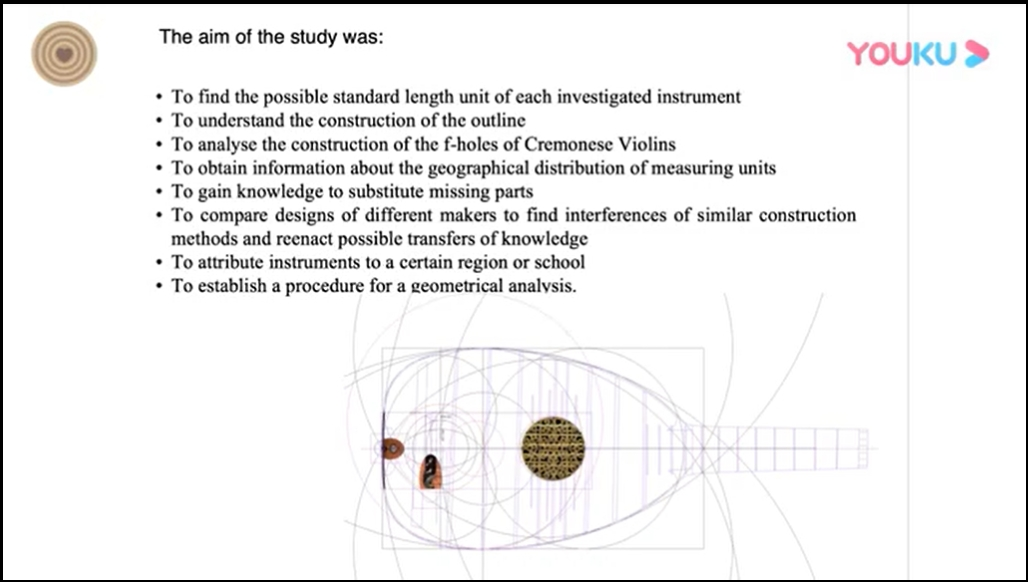 The basis of geometrical analysis was undertaken, in one way, by studying & drawing the outlines of real objects such as violins of Antonio Stradivari, instruments of Gasparo da Salo, a viola da gamba of Henry Jaye & guitars of Johann Georg Stauffer & in another way, by studying high quality photographs of instruments and applying reliable measurements.